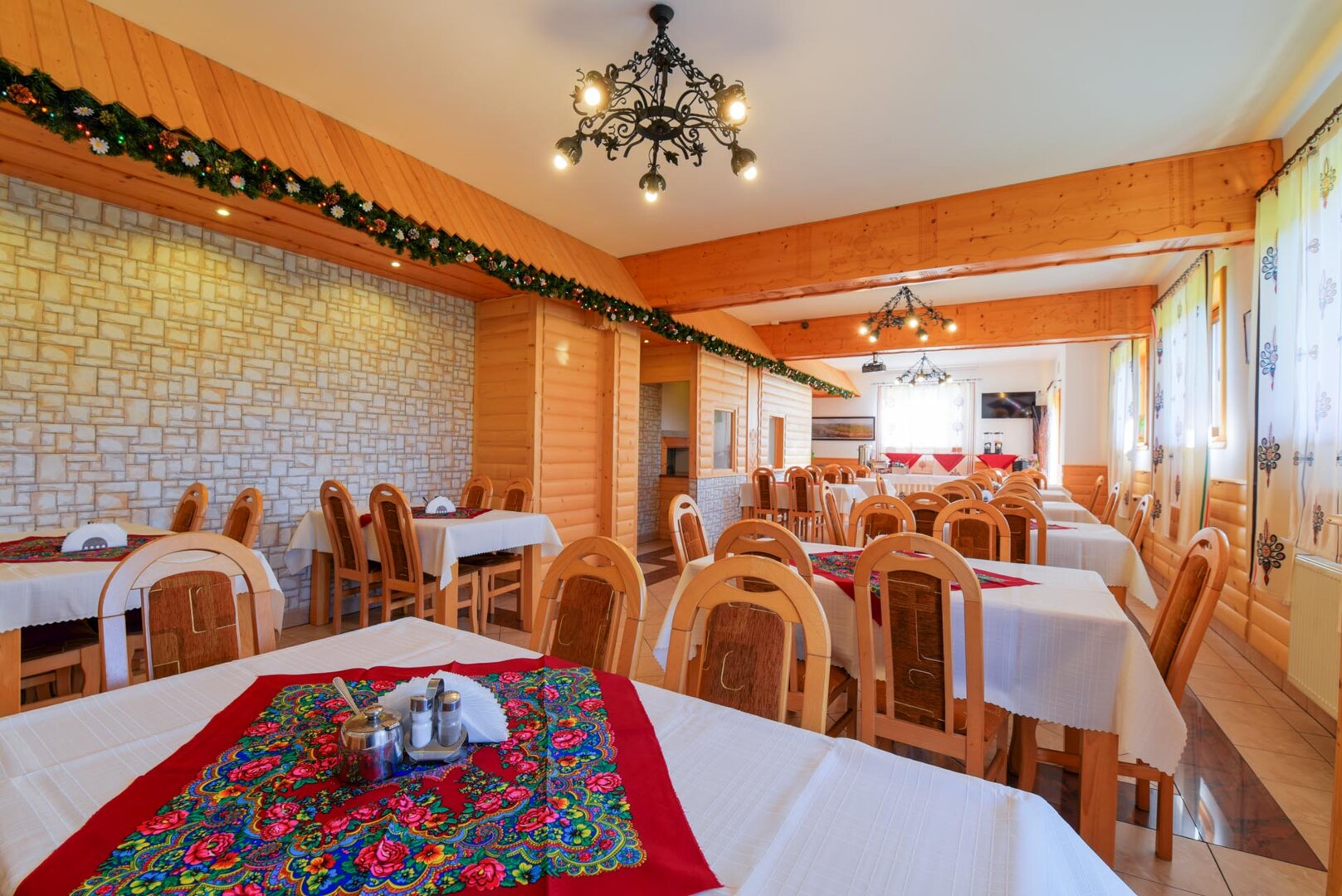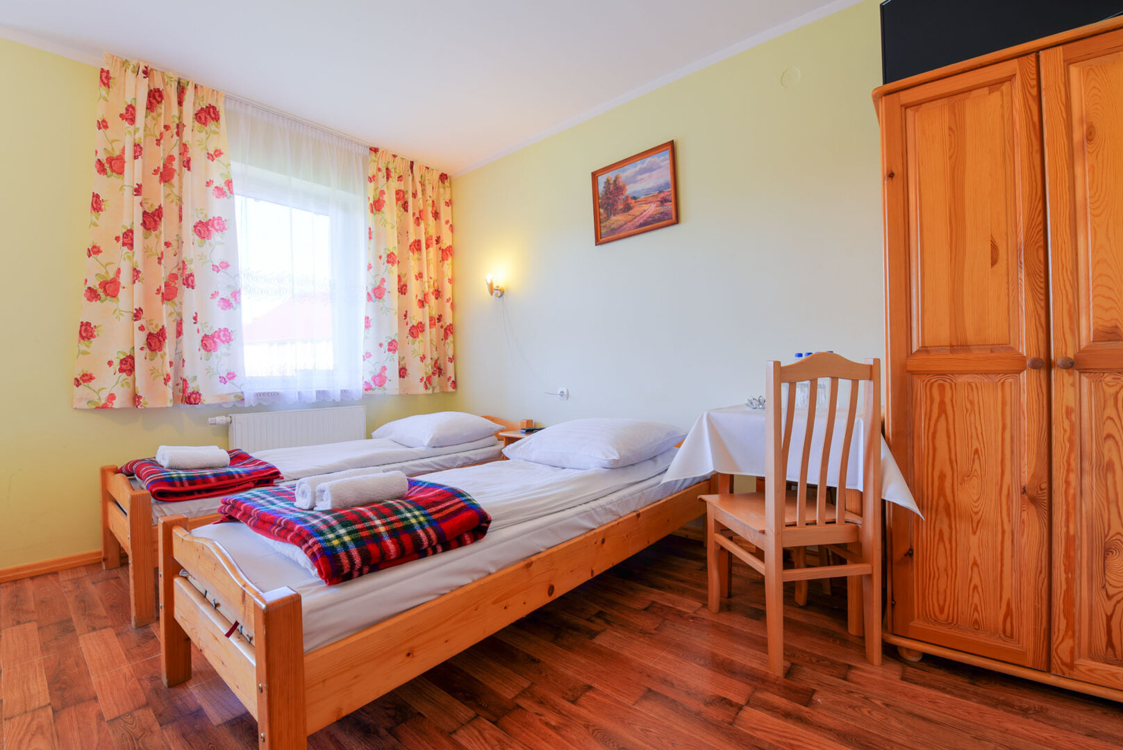 Do dyspozycji naszych Gości oddajemy eleganckie pokoje 2, 3 i 4 – osobowe z osobnymi łazienkami. W każdym z pokoi znajdują się drewniane, regionalne meble, telewizory LCD oraz bezpłatny dostęp do szybkiego internetu Wi – Fi. Nasz obiekt posiada własną stołówkę zgodną z wymogami HACAP, gdzie przygotowujemy smaczne domowe posiłki. Dysponujemy dużą świetlicą, w której można zorganizować turniej tenisa stołowego lub pograć w piłkarzy ki. Świetlica wyposażona jest w oświetlenie dyskotekowe i sprzęt nagłaśniający pozwalający zrobić dyskotekę . Teren ośrodka o pow. 5000 m kw. jest ogrodzony, znajduje tam plac zabaw